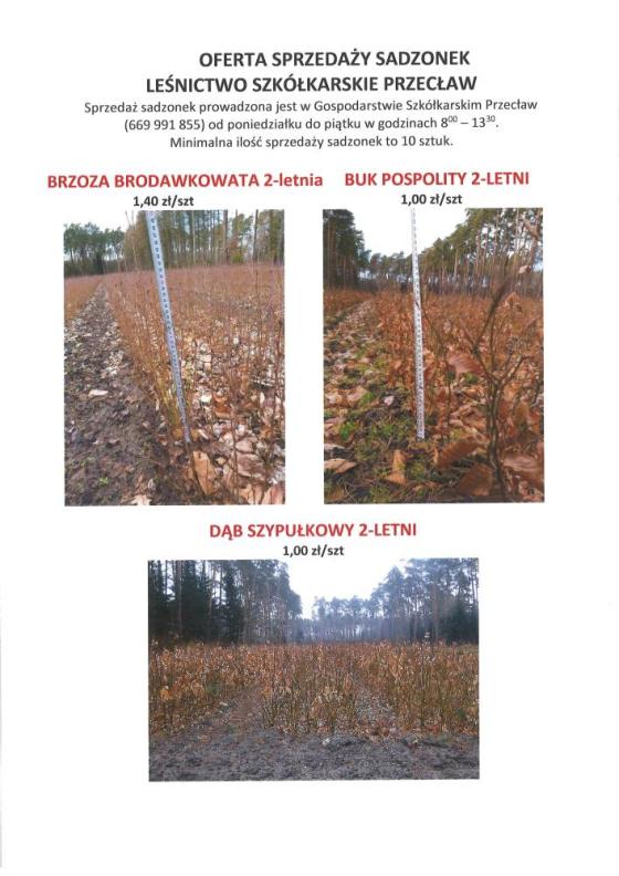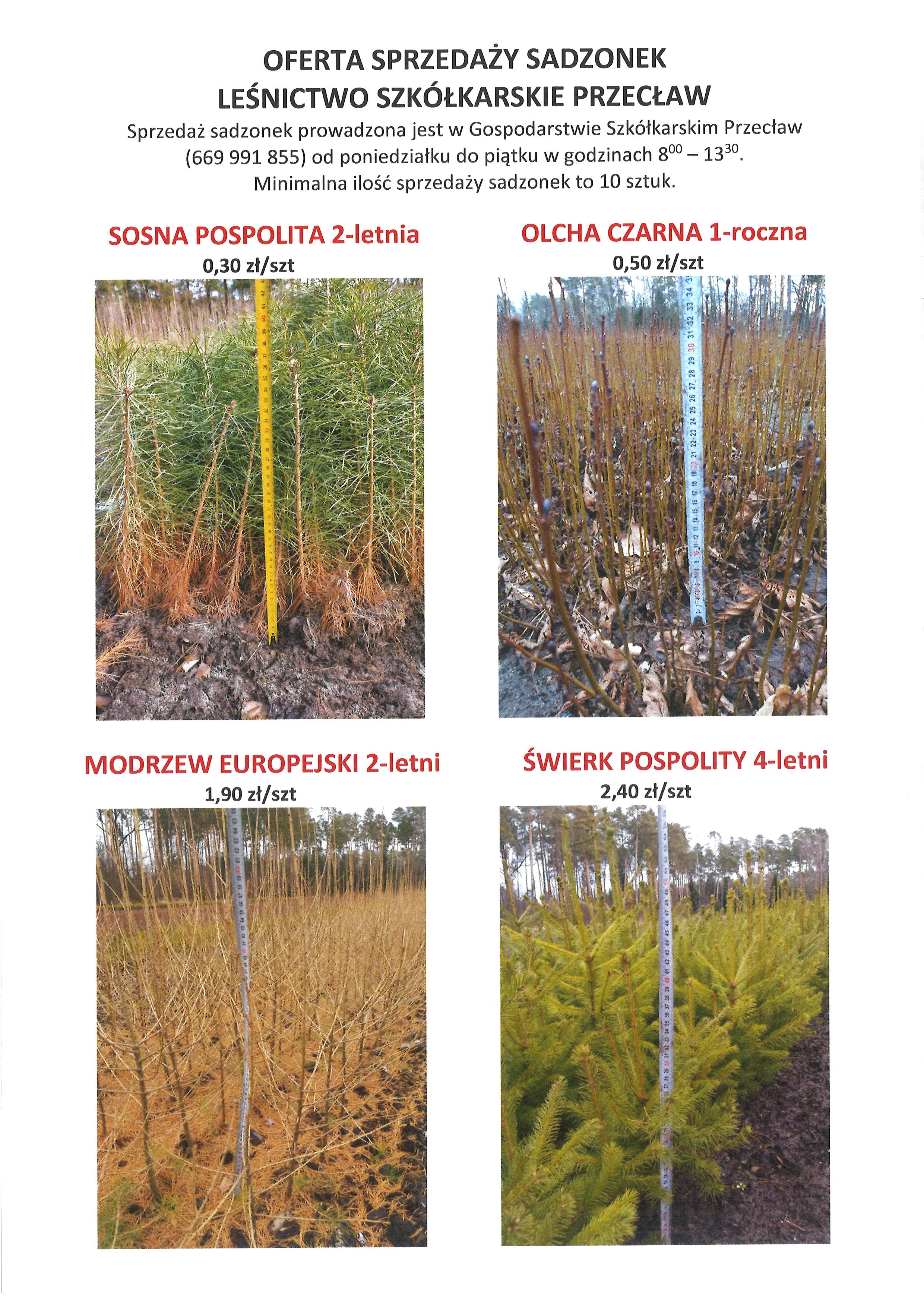 Sprzedaż sadzonek prowadzona jest w Leśnictwie Szkółkarskim Przecław (669 991 855) od poniedziałku do piątku w godzinach 800 – 1330. Minimalna ilość sprzedaży sadzonek to 10 sztuk.